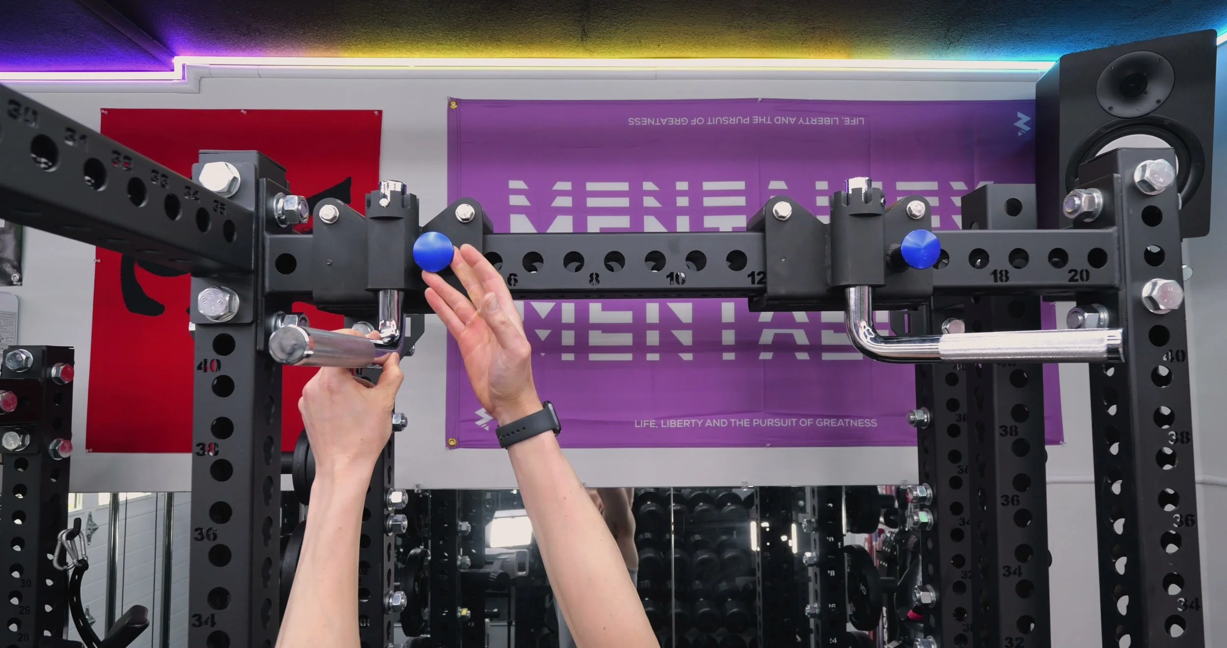 This mounts to any 3×3 rack using a pair of sliding brackets, and on my 100-inch Titan Series rack I can adjust it high enough that I’m on my toes at 6’2”, which is fine in practice. The handles are the star here: 32mm diameter with light-to-medium knurling feels just right, especially for neutral and underhand work where cheap smooth handles usually slip. Rotating them in 45-degree increments makes it easy to go from narrow neutral to wide pronated without unbolting anything. The UHMW rollers are smoother than they look, but you do have to tighten them just right—too tight and they don’t slide, too loose and you get extra play. Once you’re hanging from them, gravity locks everything in place and they don’t wander side to side.